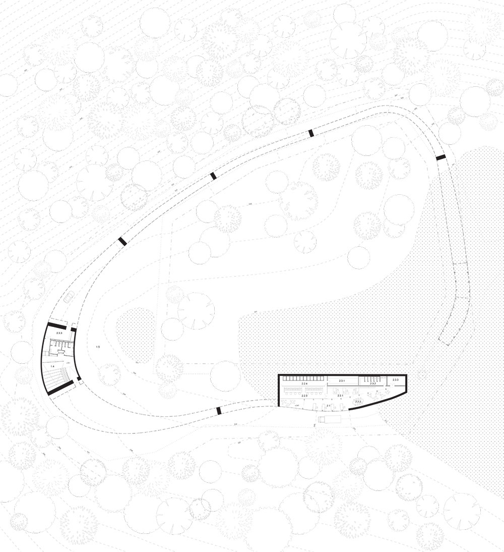 The path is detached in height from the ground, liberating the space on the hilltop and allowing the forest to complete itself into a continuous and uninterrupted landscape. Meanwhile, by placing the path at the external site boundaries, a generous garden is liberated into the interior of the area.